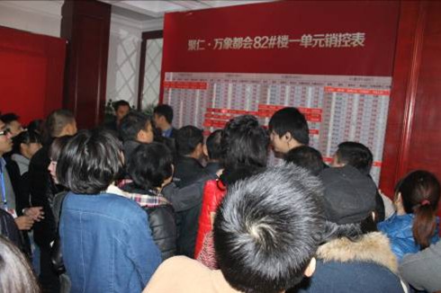當天上午8時不到,聚仁·萬象都會臨時銷售中心門口已是人潮涌動,大批意向客戶早早就來此等候,他們當中有許多都是一家老小齊出動,顯然對此次購房非常看重。8時58分,選房活動正式開始,主持人采取搖號的方式進行開盤。每次搖出8組客戶,外圍購房者按照抽中的VIP號分批進內場進行選房,而內場選房區也是人頭攢動,頻頻傳出成交捷報。整個選房活動持續了大概3個多小時,從抽號、選房、到簽收、再到付款,開盤井然有序地進行著,大多數購房者都選到了心儀已久的房子。一位成交的客戶帶著交易合同從選房區出來時早已是滿臉笑容,她一邊急切地舉著手中的材料喊著家人過來分享,一邊打電話向之前引領她看房的置業顧問報喜,“買到了,買到了,買到了,就是我看中的那個房型,樓層也很好,太高興了!”