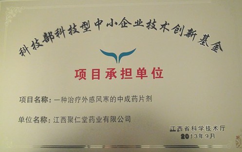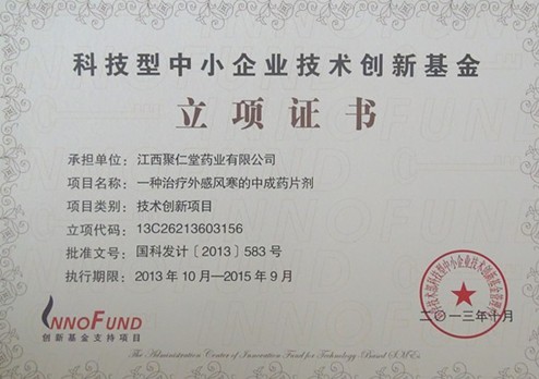 近日,由江西聚仁堂藥業(yè)有限公司生產(chǎn)的傷風停片獲得科學(xué)技術(shù)部大力支持,成為科技部科技型中小企業(yè)技術(shù)創(chuàng)新基金項目,并被授予70萬元創(chuàng)新基金。與此同時,江西省科學(xué)技術(shù)廳向聚仁堂藥業(yè)頒發(fā)了“科技部科技型中小企業(yè)技術(shù)創(chuàng)新基金項目承擔單位”牌匾。