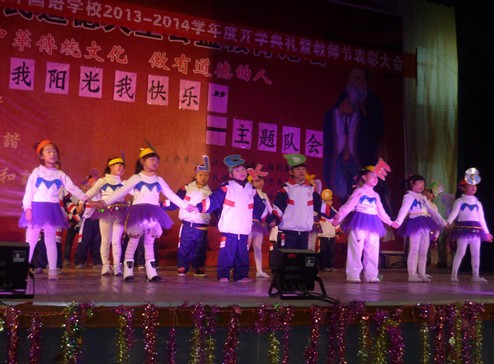 隊(duì)會(huì)在莊嚴(yán)的少先隊(duì)出旗曲中拉開序幕,少先隊(duì)隊(duì)歌《我們是共產(chǎn)主義接班人》響徹大廳。整個(gè)隊(duì)會(huì)采用互動(dòng)形式,臺(tái)上臺(tái)下融匯一起,小學(xué)一至六年級(jí)的同學(xué)們?cè)谖枧_(tái)上用文藝形式表現(xiàn)出學(xué)校貫行“陽(yáng)光教育”的主題,青年教師也著裝上臺(tái)朗讀,表達(dá)了爭(zhēng)做陽(yáng)光教師的心聲,一曲《陽(yáng)光總在風(fēng)雨后》將教師團(tuán)結(jié)合作,共建陽(yáng)光和諧校園。