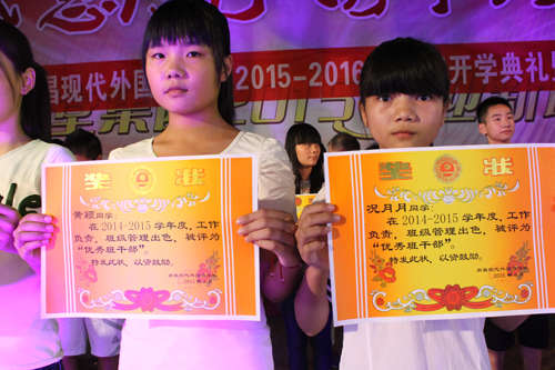 鄧校長宣布了優(yōu)秀教師、先進工作者,文明之星,進步之星,優(yōu)秀班干,三好學生名單,劉雁華等校領導為獲獎班級和個人頒獎并合影留念。