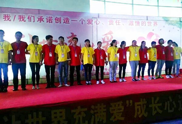 早在活動正式舉辦前,成長心連心公益團隊就與我校多次協商,希望布置出一個溫馨美麗、充滿愛意的活動環境。18日,熱心的義工們忙里忙外了整整一天,精心打造出了愛的家園,將夢想變成現實。校門口搭建了紅色的彩虹門,會場外有簽到墻、活動牌,不時有彩色氣球點綴其中。會場內除了搭建巨型舞臺外,還在舞臺四周共放置了許多大展板,上面分別寫著“表達愛、奉獻愛、傳遞愛”、“愛要說出來才是愛”、“我、我們承諾創造一個和平、共贏的世界”、“讓世界充滿愛”等大標語。這些滾燙的話語讓每一個進入會場的人都熱血沸騰、激情滿懷。