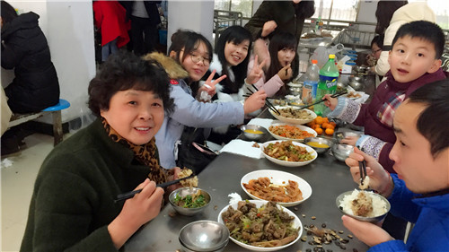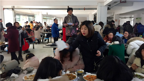 金猴報歲一年去,雄雞啼春好景來。2017年1月17日下午,南昌現代外國語學校(象湖校區)食堂歡聲笑語,喜氣洋洋。全校教職員工齊聚一堂,以聚餐的形式為自己一年的努力喝彩!這是一個幸福快樂的家庭聚會,一個230多個教職員工的大家庭,勞作了一年,聚在一起,品嘗汗水培育的果實的聚會。會上,李金玉校長作了新年賀詞,她說:“我們有緣相聚在聚仁堂集團,在大家的共同努力下,我們學校發展規模上了一個新臺階。今天讓我們共同舉杯,慶祝本學期工作圓滿結束,祝愿大家過一個萬事如意平安年,夢想成功發財年”。副校長胡卓越彈起了手風琴,一同和老師開心得歡樂起來。食堂大姐端來甘甜的美酒,讓大家開懷暢飲。一時間,會場沸騰起來了,歌聲、笑聲、喊聲,大家在把酒言歡中交流新年愿望。對酒當歌,人生幾何,老師們盡情揮灑自己身為現外人的幸福!
