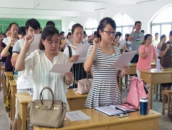 會議第一項為介紹新老師,因學校的發展與規模的擴大,該校今年新納了36位新教師。這一批新教師,以有經驗的年輕人為主力軍。第二項由特聘江西省特高級教師、第一批學科帶頭人錢老師作為教研顧問發表講話,他的講話重點圍繞“教書育人”這一中心,告訴大家要關心學生,教會學生學習、溝通的能力;要樹立“一切為了學生”的思想,教師本身不斷地學習,形成名師效應。第三項由付紹玫校長宣讀市教育局“進一步加大在職教師有償家教管理”的重要文件。第四項,楊端煌校長宣讀承諾書,承諾對學校依法管理,誠信管理,民主管理。維護學校利益,保障教師權益。全體教師承諾教書育人,愛校敬業,尊重領導和家長,遵守學校規章制度。