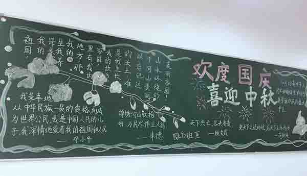 為了創建優美舒心的校園環境,促進學生身心健康發展,促進師生關系融洽、和諧發展,培養學生的審美能力、想象力和創造力。在祖國母親68歲華誕來臨之際,南昌現代外國語象湖學校于9月30日組織學生開展以“迎國慶 慶中秋”黑板報評比活動,即豐富學生的校園文化生活,也是學生送給祖國母親的最好禮物。