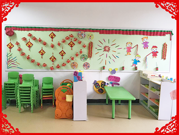 活動中,教師與幼兒進行了關于春節的互動話題,通過談話幼兒了解了春節的來歷及一些風俗習慣,并結合本班孩子的年齡發展特點,充分發揮想象力和創造力,師幼共同參與,廢舊利用創設了吉祥的紅燈籠、色彩絢麗的煙花、一串串紅紅的鞭炮、漂亮的剪紙“窗花”、“雪花”,使每個班級的主題墻都充滿了喜迎新年的節日氛圍,真是班班有特色,班班有新意。