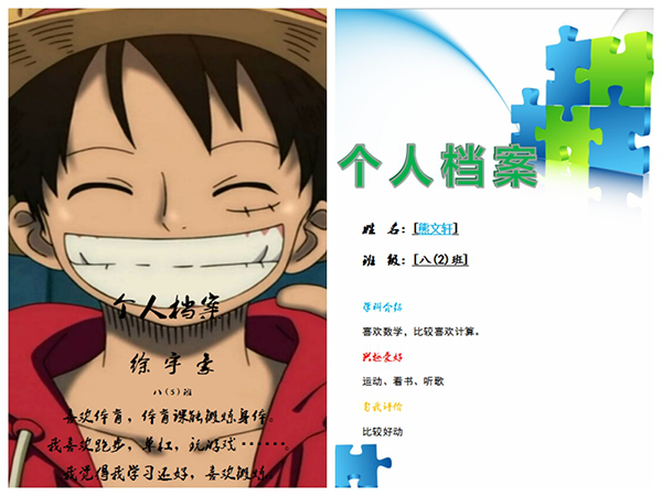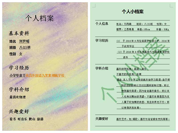 此次參賽作品的文字內容包含四方面:一、基本信息;二、學科介紹;三、興趣愛好;四、自我評價。同學們以自己為主,發揮想象,根據自己的興趣愛好,自由創作。