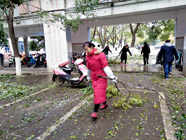 今年的冬天,南昌遇上十年不遇的極寒天氣,寒風刺骨、道路結冰、樹掛冰凌,大批樹木枝丫折斷,掉在路面,給師生出行帶來了諸多不便。29日一早,為了不影響學校的教育教學,教職員工在楊校長的統一部署下,大家拿起鐵鍬、掃帚迅速展開清雪、除枝的勞動。