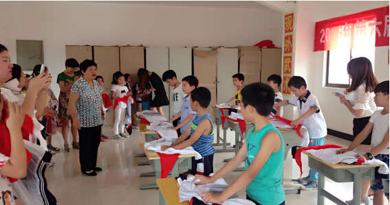 三年級是穿衣服、戴紅領巾、系鞋帶比賽。比賽現場,他們個個精神飽滿、動作嫻熟,你追我趕,很快地完成了佩戴紅領巾,穿衣服、系鞋帶的任務。