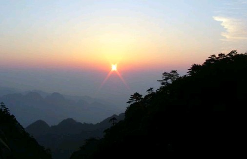 也許是一天的旅途太累了,也許是三清山的美讓人醉了,第二天一早我醒來的時候,竟然沒看到其他同事。外面天已微亮,沒辦法,為了不讓大家留下遺憾,我只得拿著攝像機跑到平臺上。此時,太陽還未升起,天空異常晴朗,東方已經是紅彤彤的一片,環顧四周,“五指山”業已染上了紅褐色,莊嚴而肅穆地矗立著;司春女神在晨曦中靜靜地俯視著群峰;布谷鳥的鳴叫聲回蕩在山谷中,是那么清脆動人。遠處高山上傳來的對話聲,想來也是同道中人。等了十幾分鐘后,我看到了一次雄偉、瑰麗的日出景象。一開始那旭日露出小小的一點,輝映著朝霞,光芒四射,令人不敢張開眼睛直視。我趕緊架好攝像機,記錄著這令人激動的一刻。過了一會兒,紅日冉冉上升,光照云海,五彩紛披,燦若錦繡,身后的“五指山”也已經從紅褐色變成了燦爛的金色。環望四周,恰好有一陣山風吹來,云煙四散,峰壑松石,在彩色的云海中時隱時現,瞬息萬變,猶如織錦上面的裝飾圖案,每幅都換一個樣式。我不禁感嘆,日出東方,壯哉!我大山河!