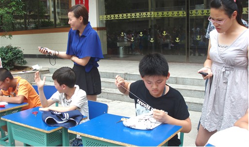 最難的比賽要數縫扣子了,穿針、打結、縫扣,都是細致活,沒有做過的還真是無從下手。從有的小選手們縫扣子熟練的程度來看,肯定是在家曾經做過針線活,有的只有二十幾秒鐘就將扣子釘好,獲得了大家熱烈的掌聲!